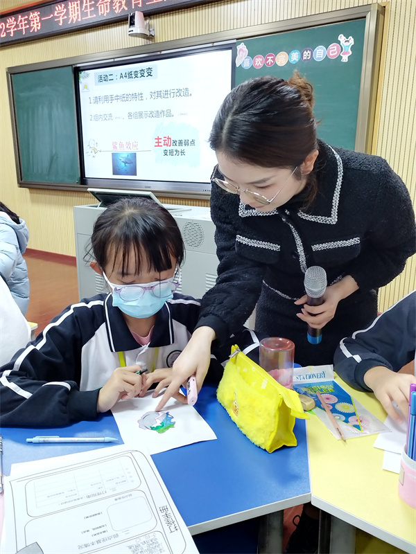 梁釗林紀念小學何茜老師執教課例《喜歡不完美的自己》。何老師教態親切,注重生成,首先創設暖身游戲:我說你做,活躍課堂氣氛;接著以繪本《走開,大黑兔》為載體,引導學生正視自己的弱點、學會接納弱點;最后通過我的弱點怪、A4紙變變變、打怪手冊三大活動循循善誘,讓學生在活動體驗中逐步認識自身優點及弱點,學會悅納自己,成就陽光自我。