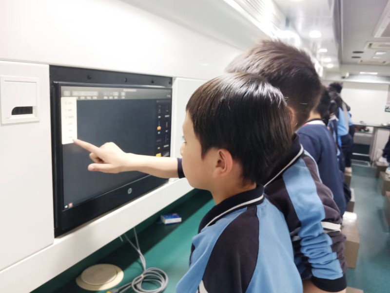 龍實學子在科學老師們的帶領下,井然有序地來到了“探索號”前,他們充滿好奇,紛紛想趕緊乘上“探索號”,一探究竟!一進入“探索號”,映入眼簾的是各式各樣的先進設備和實驗探究儀器,同學們對電子顯微鏡、電磁感應、小燈泡的串聯與并聯電路、可樂發電、制造彩虹等一系列的數字化實驗都非常感興趣,加上車內專業老師的生動講解,充分激發起龍實學子對科學探索的好奇心。