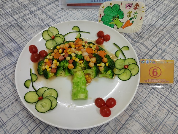 一道道色香味俱全的菜品在大家精湛的廚藝下呼之欲出,令人垂涎欲滴。一招一式盡顯大廚風范,看!花開富貴、孔雀開屏年年有余、四季常青……小廚師們發(fā)揮了奇思妙想,給這些菜肴取了一個個特別的名字!