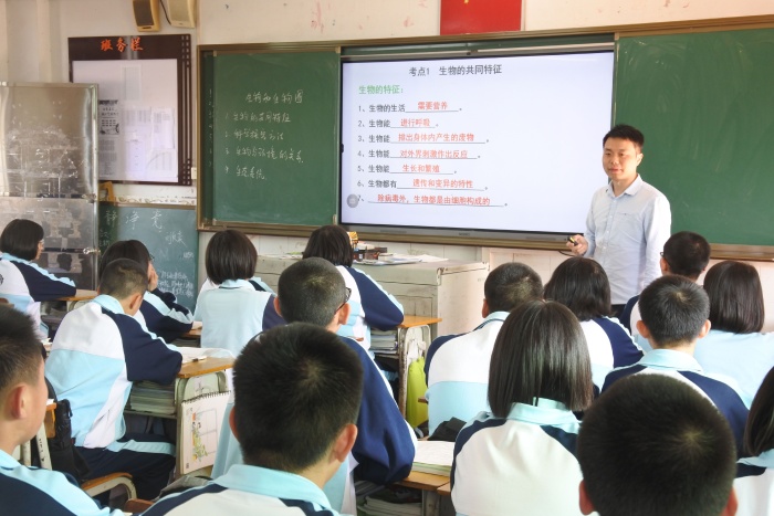 板芙初級中學青年教師潘霖向與會人員展示了一節復習研討課《生物和生物圈》。他利用考點知識點的朗讀作為導入,引領學生更好進入學習狀態;繼而為學生介紹本課近幾年中考考查情況、強調重難點。針對考點,潘霖采用知識點回顧、練習、配以中考考題等教學策略,幫助學生建構知識框架,促進學生對一般概念的記憶理解。同時,鼓勵學生上臺講解,開展小組交流,充分調動學生課堂參與熱情。
