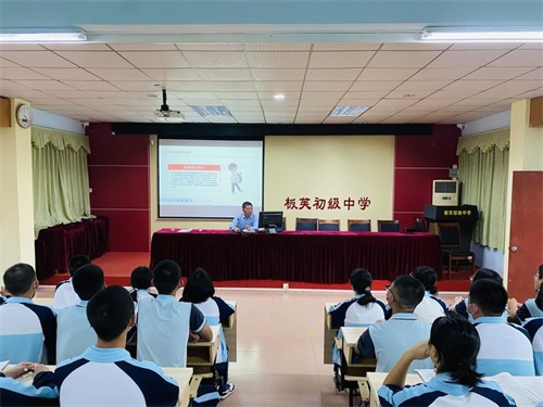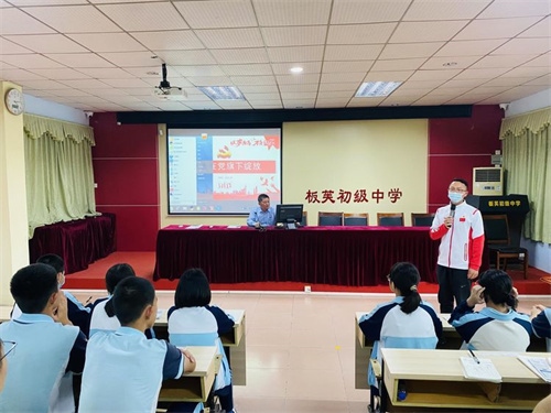 為充分發揮團組織教育青少年的功能,進一步加大對團員青年、入團積極分子的培養教育力度,實現以“黨建帶團建”的目標,4月11日,板芙初級中學在弘毅樓一樓階梯室舉行“黨支部書記上團課”活動。該校黨支部書記、校長吳勇明以《永遠跟黨走,建功新時代》為題講授團課。活動由該校團委書記梁博煜老師主持,各班團員代表、入團積極分子共70多位同學參加。