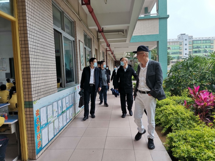 3月24日上午,春雨綿綿,中山市教體局副局長姜術俊、市紀委相關領導、市教研室相關領導、板芙鎮黨委委員顏倫枝、板芙鎮教體中心肖繼文老師等領導蒞臨芙蓉學校視導,檢查疫情防控及教學教研情況。