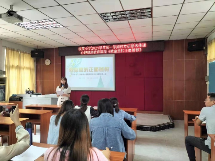 為了進(jìn)一步提高學(xué)校教師專業(yè)發(fā)展水平,提升學(xué)校發(fā)展核心競爭力,板芙小學(xué)深挖校內(nèi)資源,以授課、講座等形式構(gòu)建板芙小學(xué)校本研修選修課程。2021年12月3日,吳丹婷老師在板芙小學(xué)階梯室開展校本研修選修課程的第一次課程,題為《教室里的正面管教》的心理健康教育校本研訓(xùn)。