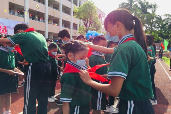 伴隨著嘹亮的少先隊隊歌,入隊儀式在雄壯的出旗曲中拉開序幕,大隊輔導(dǎo)員梁稈娣宣讀了新隊員名單,六年級的老隊員為新隊員佩戴了紅領(lǐng)巾,并進行了宣誓。老隊員代表梁樂怡和一年級新生代表高紫嫣分別做了精彩的發(fā)言,整個入隊儀式規(guī)范而且有序,處處洋溢著濃濃的溫暖之情。