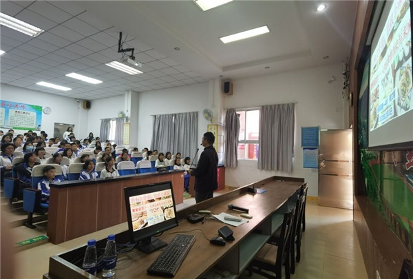 講座中,賴老師引經據典,由古至今,從中到外,介紹了人類蟲食的古老傳統、現狀及未來的可能。他根據少年兒童的認知特點,深入淺出地講述了昆蟲作為食物具有效率更高的飲食方式等特點以及轉變人類飲食結構的可能等一系列知識。賴老師講解生動,肢體語言豐富而又夸張,一次次地點燃了孩子們思維的火花。借助精美的圖片和科學的視頻,賴老師將深奧的科學知識講得簡單明了、通俗易懂,引起學生的共鳴,同學們的臉上洋溢著笑容,會場上一次又一次地響起熱烈的掌聲。