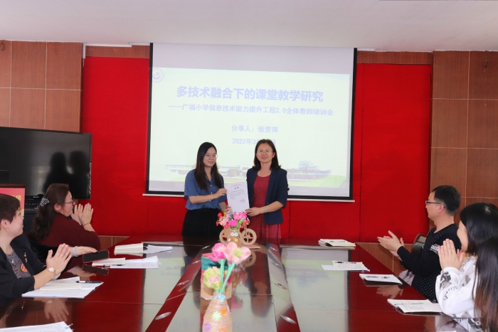 3月14日下午,廣福小學(xué)邀請該校信息技術(shù)骨干張芳萍老師為老師們做信息技術(shù)應(yīng)用能力提升工程2.0項目培訓(xùn),張老師以《多技術(shù)融合下的課堂教學(xué)研究》為題,從基本的操作步驟、科組研修任務(wù)、教師如何選擇合適的能力點,以及視頻制作等方面進行詳細介紹,為全校教師在實現(xiàn)學(xué)科教學(xué)與現(xiàn)代信息技術(shù)深度融合方面指出了清晰的方向。校長蘇雪霞充分肯定了張老師的培訓(xùn),要求全體老師要細加領(lǐng)會消化,不斷提升課堂高效教學(xué)。