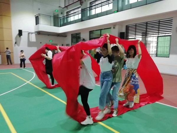 在工會主席和體育教師的精心策劃下,老師們以科組為單位組隊參加比賽,各科組精心挑選參賽教師參賽。本次教師趣味運動會比賽項目在內容和形式跟往年比都有創新,除了接力運網球外,還增加了火龍滾動輪。兩個比賽項目都強調了團隊的合作性和一致性,同時也突出了趣味性和娛樂性。賽場上,老師們都全力投入,團結協作,你追我趕,使出渾身解數,志在必得,力爭第一。旁邊的老師加油聲、吶喊聲不斷,場上充滿了老師們的歡聲笑語,其樂融融。