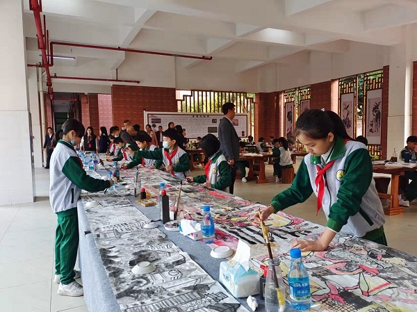 活動(dòng)伊始,評(píng)估組一行人觀看學(xué)校特色項(xiàng)目葫蘆絲表演《聽我說謝謝你》、笛子吹奏《我的中國(guó)心》、網(wǎng)球操和國(guó)畫展示活動(dòng)。在這個(gè)環(huán)節(jié)中湖小學(xué)子給評(píng)估組專家們帶來(lái)了視覺和聽覺的盛宴,笛聲悠揚(yáng)、絲竹悅耳,網(wǎng)球拍揮舞間盡顯湖小學(xué)子的朝氣蓬勃,丹青國(guó)畫皴染勾勒形神具備,趣味盎然。