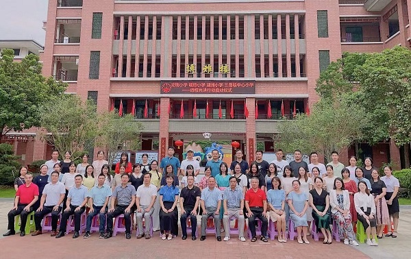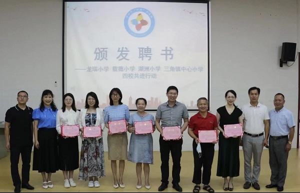 9月27日下午,中山市教師發展中心主任洪世林博士及該中心趙龍山、李泳綺、袁蓓、張梅青、劉月、韓雨等專家團隊成員,三角鎮教育和體育事務中心(后文簡稱教體中心)副主任梁文、沙溪鎮教體中心孫彥濤老師、三鄉鎮教體中心教研員蔡新安老師,板芙鎮教體中心教研員張運生、柯婉婷老師,板芙鎮教師綜合素養培育基地顧問、湖洲小學陳景新副校長,沙溪鎮龍瑞小學校長高玉璇、三鄉鎮載德小學校長毛義祥、三角鎮中心小學校長吳博事 、湖洲小學校長鄭少君,以及四校行政、科組長、骨干教師歡聚在板芙鎮湖洲小學,舉行四校共進行動啟動儀式。四校校長向中山市教師發展中心的專家團隊頒發聘書。