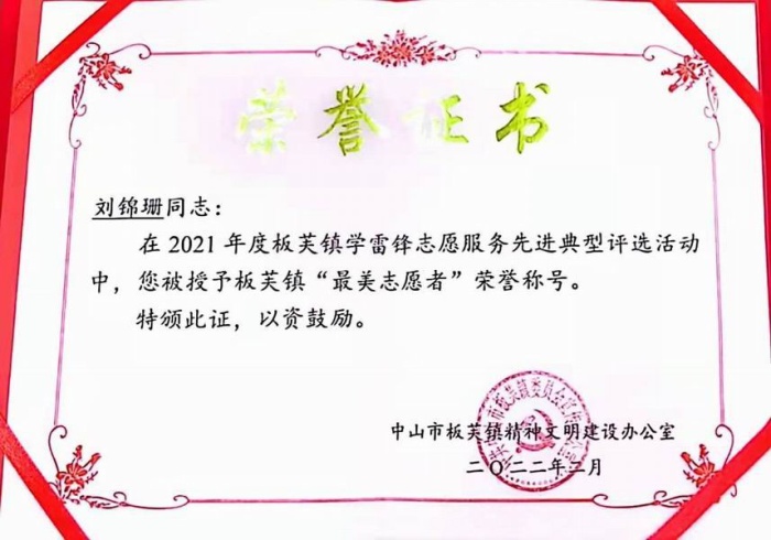 劉錦珊是深灣小學“紅棉花香”紅領巾親子義工隊的一名志愿者。她從2017年11月起參加志愿服務,參加活動300多次,時數超1100小時。她曾參與中山市慈善萬人行義工活動;到深灣村擔水坑抗日英烈陣亡遺址開展“清明祭英烈”實踐活動;參與板芙鎮30多戶特困家庭、殘疾家庭慰問活動,發動義工為深灣小學患白血病的學生捐款15600多元;多次參與板芙鎮人居環境整治和校園的交通疏導與保駕護航活動等。