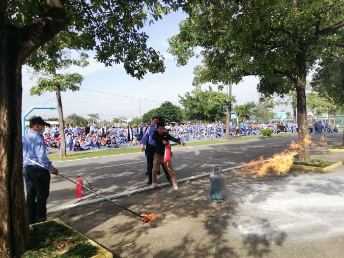 隨后,盧楚展詳細講解消防安全知識,演示滅火器的正確使用方法。只見他手持滅火器,熟練地拔掉保險栓,左手拿噴管,右手下壓把手,把大火撲滅。學校教師代表、保安、保安職工等在盧警官的指導下還模擬使用滅火器。