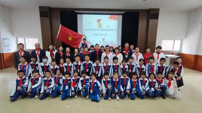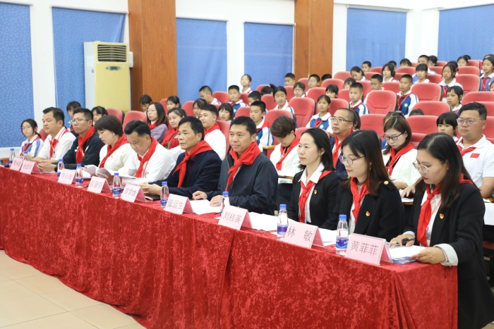 板芙鎮團委負責人黃學雄,鎮教育和體育事務中心張運生老師,新聯小學行政領導、大隊輔導員,板芙鎮各中小學大隊輔導員以及中隊輔導員代表、大隊干部、一至六年級24個中隊少先隊員代表等138人參加了本次大會,共同見證了這莊嚴時刻。