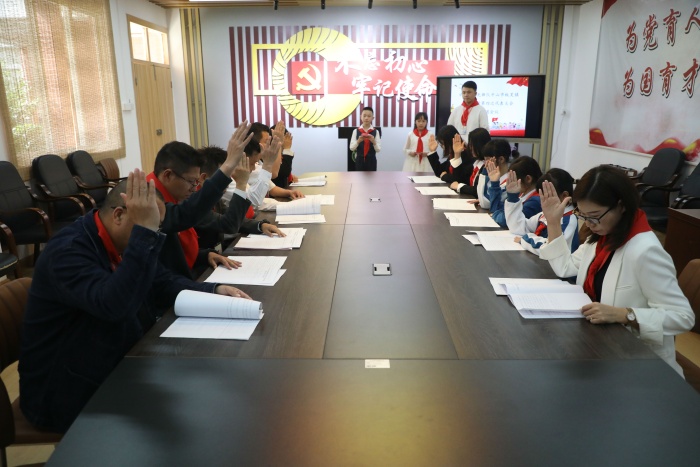 大會上,少先隊員代表為參會領導佩戴紅領巾,行隊禮致以崇高的敬意,鮮艷的紅領巾映紅了整個會場。伴隨著鏗鏘有力的出旗曲,旗手們邁著整齊的步伐,鮮艷的隊旗指引前進的方向,大會拉開了序幕。全體參會人員莊嚴肅立,齊唱隊歌,共同向隊旗致敬。