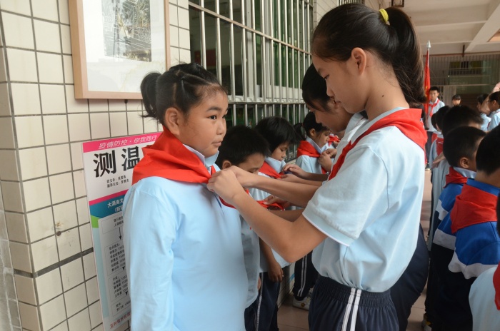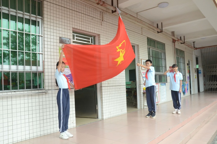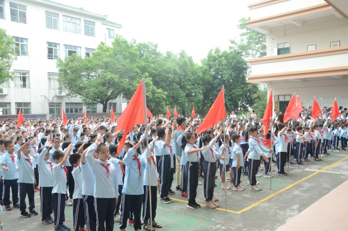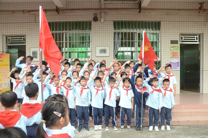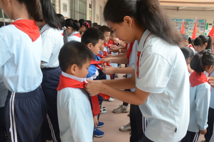 入隊儀式隨著《中國少年先鋒隊隊歌》的歌聲正式拉開序幕,少先隊輔導員王利勇老師宣布了入隊決定。通過分批入隊,本次又有130名新隊員光榮的加入了少先隊組織,這是他們光榮和幸福的時刻!決定宣布之后,六年級優秀少先隊員代表為新少先隊隊員佩戴了鮮艷的紅領巾,此刻在鮮艷的隊旗下,全體少先隊員們的莊嚴宣誓響徹大涌南文小學校園的上空。在大隊輔導員的帶領下,少先隊員們大聲呼號:“時刻準備著”,表明為共產主義事業貢獻力量的決心。