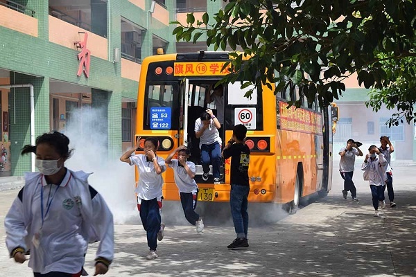 在實景模擬演練中,模擬56座“大鼻子”校車上下學時車輛遇到險情,校車駕駛員馬上啟動應急措施、及時靠邊安全停車后打開前后安全門,跟車老師和校車駕駛員迅速組織車內學生一手捂住口鼻一手抱頭從車門的安全出口有序、及時撤出,并在跟車老師指引下于安全區域有序集合,跟車老師清點人數,確定所有學生的安全情況;同時,校車駕駛員利用校車配備滅火器對險情進行初步處理。本次演練,從駕駛員發現險情到安全撤離所有學生并對險情進行初步處理,時間不超過兩分鐘,充分體現了校車駕駛員及跟車老師在接送學生上下學過程中對于緊急情況的應對能力。