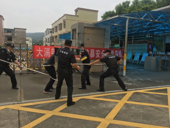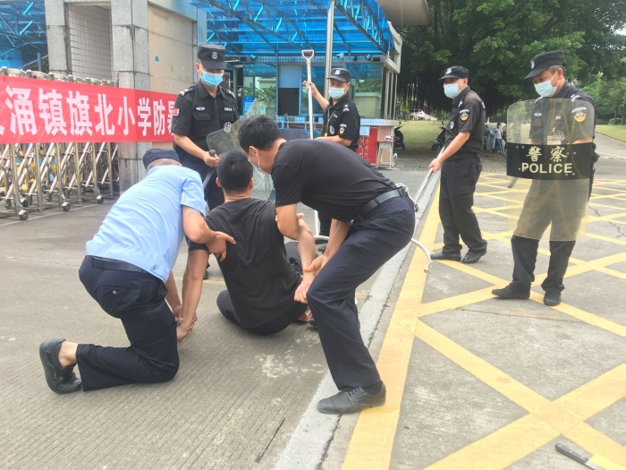 巡邏崗、校園110安保人員第一時間趕到現場,三人形成一個戰斗小組,分別手持盾牌、鋼叉和長棍,一邊對歹徒進行言語勸導,一邊組成防護隊形,合力制服“暴恐分子”。整個反恐防暴過程分工明確,井然有序,達到了維護校園安全的效果。