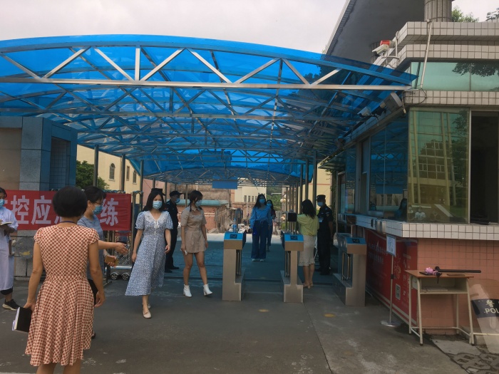 演練分為兩個場景。場景一設置在校門口,學生分批錯峰到校,學生在家長的陪同下來到校門口,學生聽從保安指揮排隊,值日行政、保安逐一檢查學生口罩佩戴是否正確。旗北小學在正門設置晨檢區域、體溫檢測2條通道,返校學生間隔保持前后1米,有序排隊等待晨檢。隨后門口測溫人員逐一對學生進行體溫檢測,學生通過體溫排查、消毒雙手方可進入校園。入校后,學生按照各年級指定路線進入教學樓。校門口是學生進入學校的第一道屏障,安全、有序、正規的檢測確保每一個學生進入學校有一個健康的身體進行學習。
