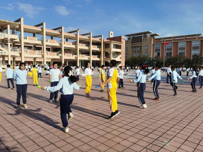 每天下午第二節課后,同學們伴隨著歡快而富有節奏的音樂聲,迅速集隊,邁著矯健的步伐來到操場開展跳繩活動。同學們在正副班主任帶領下以班級方陣依次開跳,學生們踏著音樂的節奏,喊著鼓舞士氣的口號,整齊劃一,氣勢非凡的齊跳,成為校園里靚麗的風景線。緊接著各班開展自由特色跳繩活動,在跳繩運動中同學們跳出了自信、跳出了快樂、更跳出了健康,那活躍跳動的身影似茁壯的春苗,那微露的笑容正如綻開的鮮花。