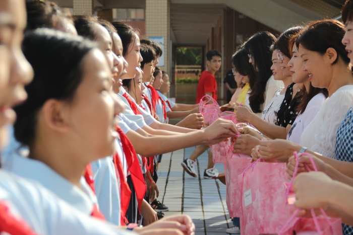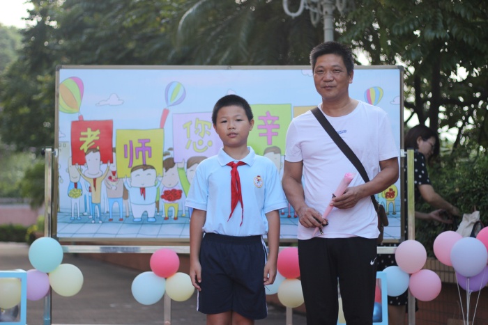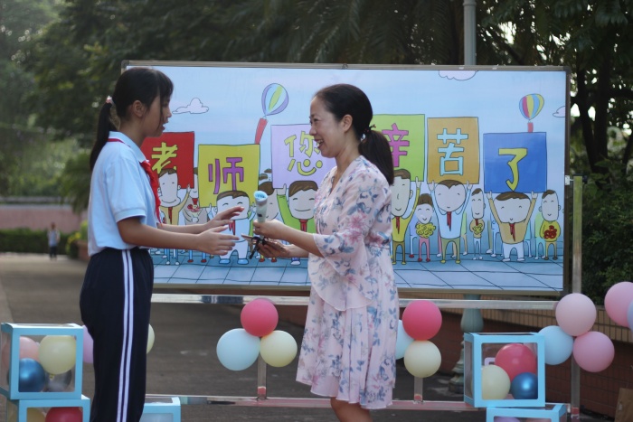 為了迎接一年一度的教師節,旗北小學全體行政和體藝科組提前精心策劃,給旗北小學全體教師送上最真摯的祝福。上午7時20分,教學樓樓梯鋪上了鮮艷的紅地毯,裝點上節日的氣球,學生每人手持鮮花,靜候旗北小學教師的到來。在“老師,我想對您說”的展板上,有學生寫的祝福語,有學生親手繪畫卡通版的教師照,盡情地展現旗北教師活潑的另一面,同時也為全體教師送去了節日的驚喜。每位教師在展板前駐足觀看,臉上綻放喜悅的笑容。隨后,各位教師走上紅毯,兩旁學生送出節日的祝福,送出鮮艷的花朵和合影留念,讓全體教師驚喜滿滿。