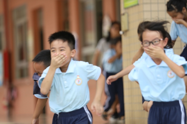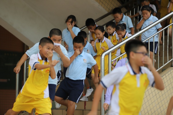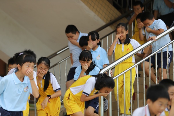 演練開始前,少先隊輔導員林嘉誠老師對全校師生進行了安全教育,指出在疏散演練中要注意安全事項和和逃生的方法。隨著警報聲響起,全校950多名學生在各班老師的指引下,弓著腰,用手、袖口、濕毛巾等捂著嘴鼻迅速有序地進行應急疏散,全體師生快而有序地撤離到校園安全地帶。從警報聲響起到最后一名學生撤離到廣場,用時3分多。學生安全撤離到廣場后,各班迅速清點人數,確保每一名學生都已安全撤離,并及時將清點結果匯報給演練總指揮李文科老師。