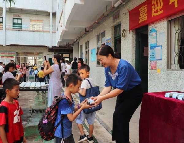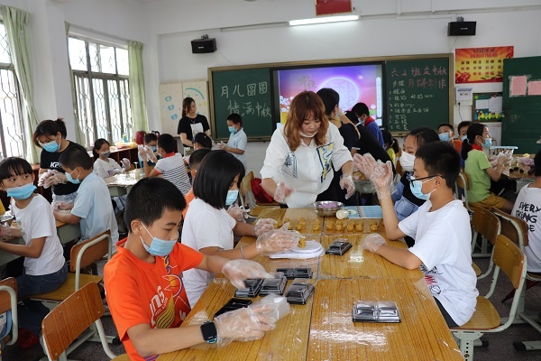 下午四點,全體師生歡聚校園,梁綺琴校長和孫林強主任為全體學生分發了月餅并送上深深的祝福。