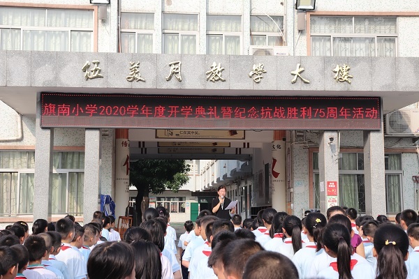 隨后,梁綺琴校長為新學(xué)期致辭,她代表學(xué)校對全體師生表示了誠摯的問候,簡單回顧了過去一學(xué)年學(xué)校取得的成績后,號召全校上下要以更加昂揚的斗志、更加務(wù)實的作風(fēng)、投入到新學(xué)年的工作中。他希望全體教師要為人師表、立德樹人,廉潔從教。她對學(xué)生們提出了幾點新要求:守規(guī)矩、敢擔(dān)當(dāng)、立好志、懂感恩。希望同學(xué)們要樹立遠大理想,勤學(xué)善思,拼搏進取,遵規(guī)守紀,牢固樹立安全意識,爭做儒雅少年。不負青春年華,做一個德智體美勞全面發(fā)展的時代新人!梁校長特別講到今年是抗戰(zhàn)勝利75周年,梁校長還以最近上演的電影《八佰》為例,以此激勵全體師生要在銘記革命歷史、緬懷先烈的同時,還要不斷砥礪前行、自立自強。