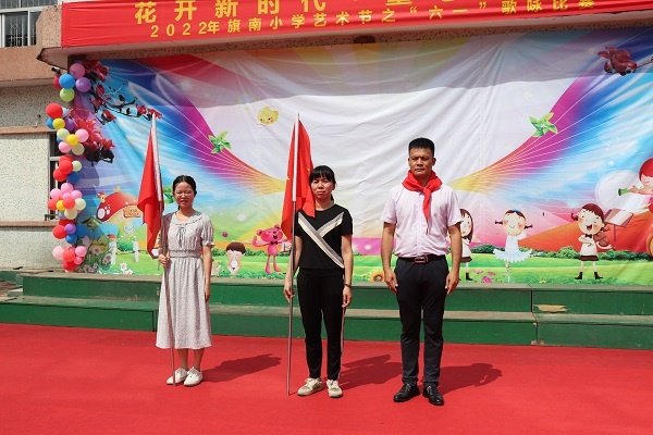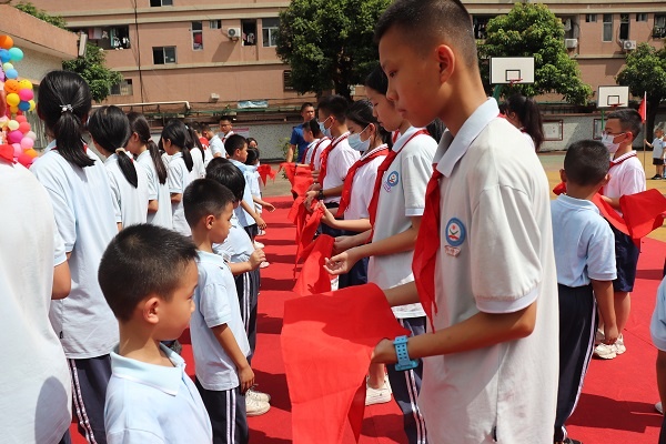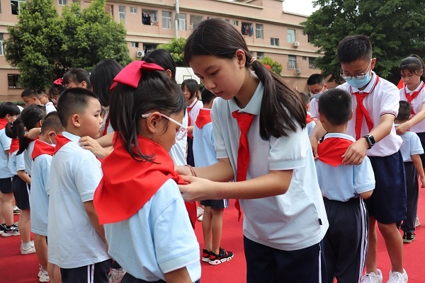 伴隨著莊嚴的出旗曲,全體隊員合唱《中國少年先鋒隊隊歌》。緊接著旗南小學大隊輔導員李楚娟老師宣讀新隊員名單,少工委主任梁鉅全同志為新成立的中隊授中隊旗,六年級的優秀少先隊員細心地為新隊員們佩戴上人生的第一條紅領巾。