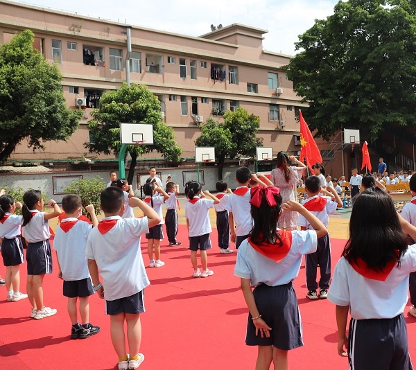 在大隊輔導員的帶領下,新隊員們高高舉起右拳,莊嚴宣誓,表示定會在星星火炬的指引下,牢記黨的教誨,全面發展,茁壯成長。隨后,梁鉅全同志為新隊員送上寄語:“希望你們以一名少先隊員的標準嚴格要求自己,主動向身邊的榜樣學習,向老隊員學習,做一名全面發展的優秀少先隊員。”最后,李楚娟老師帶領大家呼號。