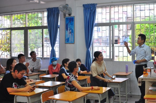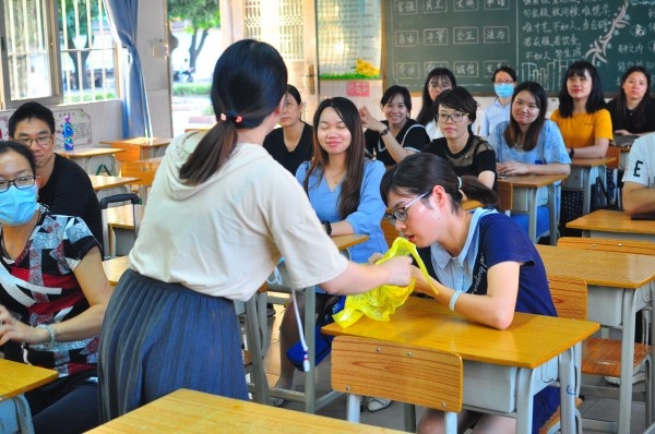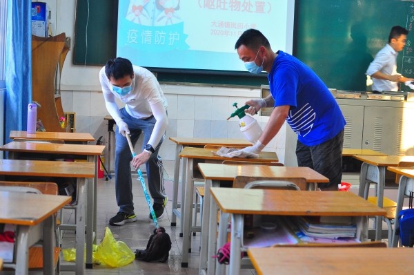 下午4點50分,模擬演練開始。上課期間,二甲班一名“學生”頭暈胸悶想嘔吐,報告上課老師。上課老師立即戴好口罩,提供嘔吐袋給學生并打電話報告領導小組成員。班長迅速疏散學生到戶外,領導小組成員接到通知,啟動應急預案,組織應急小組成員前來支援處置。衛生保健組老師對全班學生進行體溫復測,引導嘔吐學生到隔離點觀察,消毒組老師立即使用專用消毒桶、掃把、抹布等,配置消毒液,對現場進行消毒,并對嘔吐物進行殺菌消毒。演練過程迅速、有序,分工明確,在最短時間內完成突發事件應對與處理。