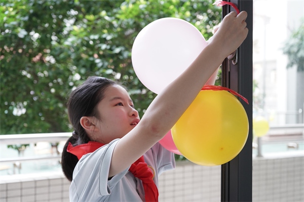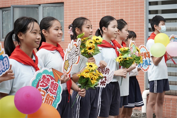 沐浴著秋日的朝陽,高年級的哥哥姐姐們也早早到校,搬桌椅、掛氣球、布置會場、列隊歡迎……為新生們的到來做足準備。