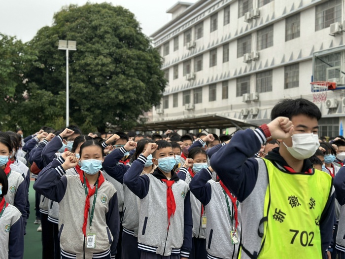 學生們高舉拳頭,以洪亮的聲音宣誓,表明了新學期將用持之以恒的行動,鍛煉自己成為有“新徽”素養(yǎng)的卓越人的堅定態(tài)度。