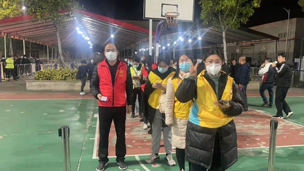 陰霾的天空,刺骨的寒風,寒冬并未因為疫情而暫停。早上6點,天還未亮的時候,東鳳鎮安樂小學教師志愿者和醫護人員以及其他志愿者們就已全部就位,駐守在自己的崗位上,在安樂公園檢測點,一切都是那樣的井然有序。在做好自我防護的前提下,安樂小學教師志愿者穿梭在隊伍中,排隊引導、清點人數、采集、錄入信息,遠遠望去總有一個個忙碌的身影為排隊等候的人們送去溫暖與關懷。“注意保持一米的距離,按照地上的紅點站好”“請提前準備好粵核酸碼”,安樂小學教師志愿者們用嚴謹的態度維持秩序,守護的是大家健康。