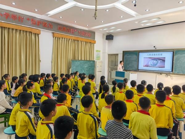 莫廣林醫(yī)生通過卡通圖片的PPT演示,結合實際情況,聲情并茂地講解了當前青少年視力不良現(xiàn)狀、近視產(chǎn)生的原因、近視的危害和預防近視等知識。莫醫(yī)生通過與現(xiàn)場學生互動的方式進行溝通,深入淺出地闡述了眼睛的重要性。同時針對目前青少年兒童近視發(fā)病率較高的特點,闡述了近視給學習、生活帶來的極大不便;詳細地講解了保護眼睛的基本常識,從保持正確讀寫姿勢、養(yǎng)成良好的用眼衛(wèi)生習慣、保證睡眠、均衡營養(yǎng)、藥物治療等幾個方面向學生介紹了如何保護眼睛預防近視。他特別強調(diào):要注意用眼衛(wèi)生,保證充足的睡眠時間;要堅持認真做好眼保健操;要不偏食挑食;不長時間玩電腦手機、不看電視;積極參加體育鍛煉;看書寫字姿勢正確等,才能保護好視力。學生對“眼睛”有了全新的認識,現(xiàn)場氣氛熱烈,在座的同學們受益匪淺。