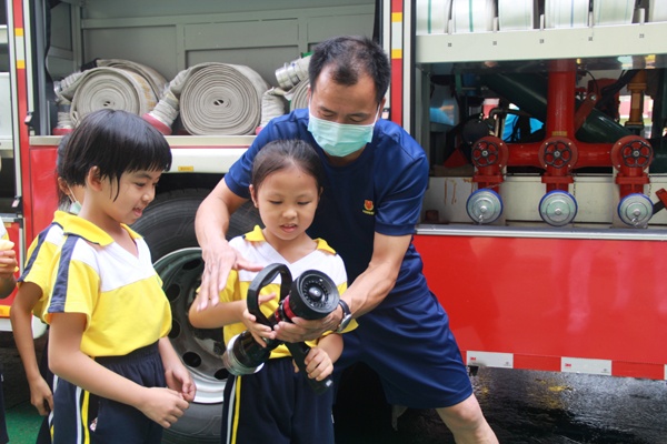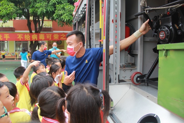 隨后,消防員詳細介紹了各種應急消防車的功能以及消防車內各種消防設備的用途,讓同學們了解了許多消防車上的“小秘密”,各式各樣的消防器材裝備深深地吸引了同學們,讓他們大開眼界。消防員還向學生們講解了如何防止火災發生、正確的救火方法以及火災發生后怎樣采取自救措施逃生等知識。