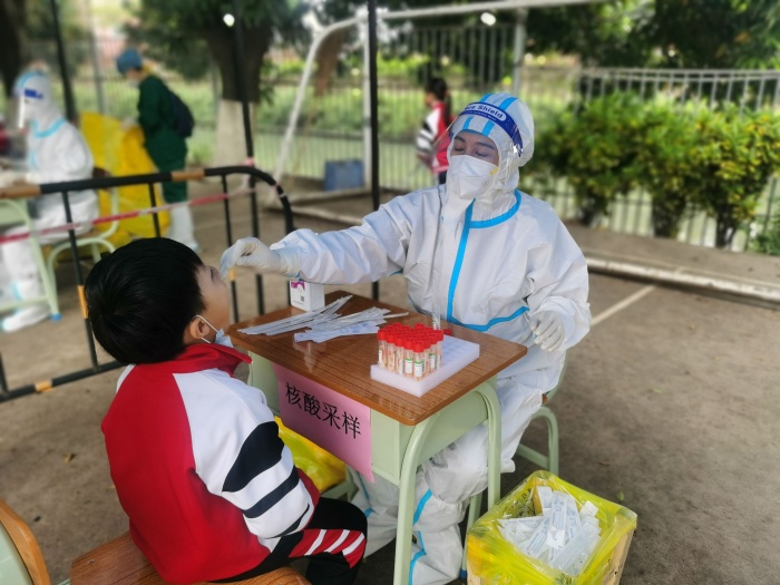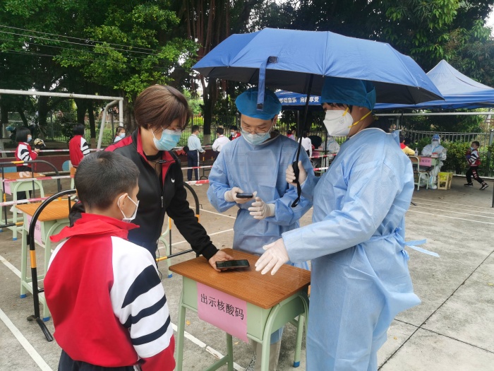 核酸檢測工作有序推進,學校老師和醫護人員對師生的信息進行了反復地核對。核酸檢測全程一人一消毒,醫務人員在現場進行咽拭子采樣,全程動作麻利,專業高效。