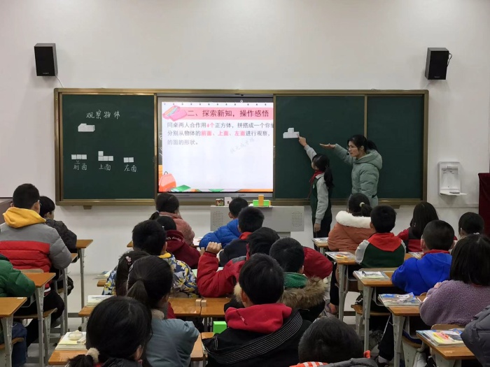 此次活動分為兩大環節,課堂展示和教學研討。第一個環節是課堂展示。首先是張愛銀老師執教四年級的《觀察物體(二)》。張老師的課堂層層遞進、環環相扣,通過“看-評-想-畫”幫助學生建立各個不同方向看到的形狀表象,發展學生的觀察能力和空間思維。接著是曾文苑老師執教三年級的《復式統計表》,曾老師引導學生經歷復式統計表產生的全過程,注重學生觀察、思考、探究、發現的過程,讓學生在思考和探究的基礎上“創造”新的統計表——復式統計表,整節課教學環節緊湊,實施過程循序漸進、扎實有效。