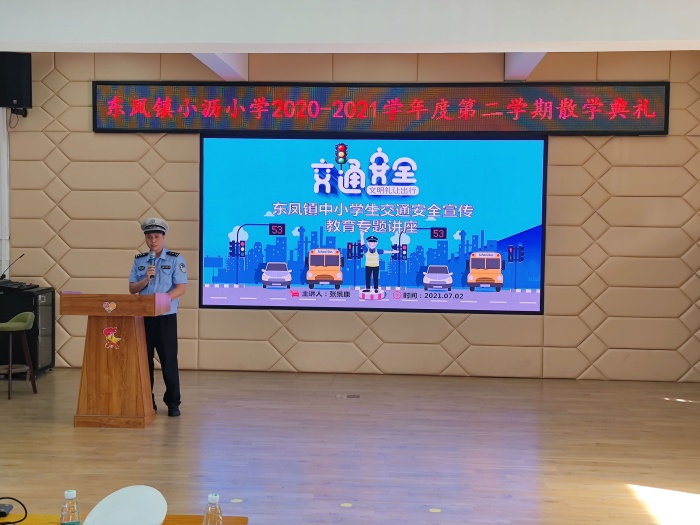 散學(xué)典禮由小瀝小學(xué)陳名勝主任主持,共有四個議程,分別是法制安全教育、交通安全教育、小瀝小學(xué)黎三妹副校長作學(xué)校工作總結(jié)以及師生頒獎儀式。首先由小瀝小學(xué)法制副校長梁凎榮警官為全體師生作了非常詳盡的暑假法制安全教育。梁警官從疫情防控、防溺水、用電安全、防詐騙等方面展開教育,重點強調(diào)暑假防疫,非必要不離粵不離市,確保安全健康返校。接著由東鳳鎮(zhèn)交通安全宣講員張景康警官為師生們作了交通安全教育。張警官從行走安全、乘車安全、騎車安全等方面提醒師生遵守交通法規(guī),注意人身安全。