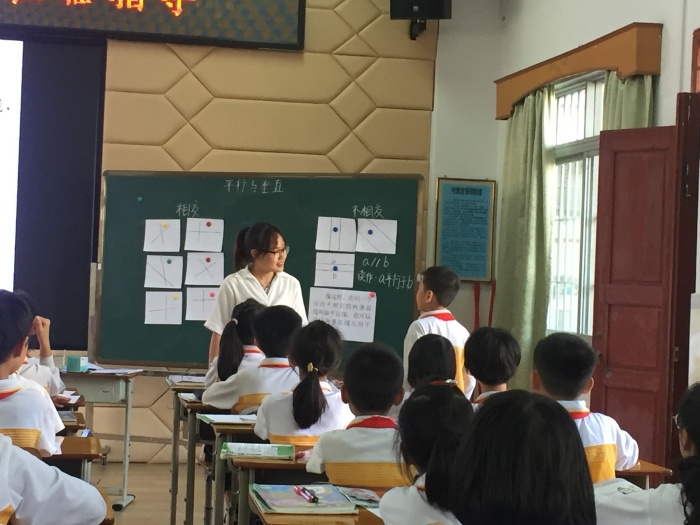 該校鄭曉茵老師和詹金娥老師開展公開匯報課。鄭曉茵執教《認識垂直與平行》一課,深入對概念進行解剖,循循善誘。隨后,詹金娥老師執教《長方形和正方形的特征》一課,從圖形的量一量、折一折、比一比等活動層層深入教學,帶領學生深入地探究了長方形和正方形的特征。
