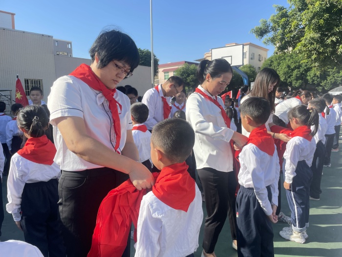 接下來小瀝小學(xué)少先隊(duì)大隊(duì)長進(jìn)行了發(fā)言,以實(shí)際行動(dòng)給新隊(duì)員們樹立了良好的榜樣。而后大隊(duì)輔導(dǎo)員梁月儀老師宣布了新隊(duì)員的名單,并請(qǐng)學(xué)校領(lǐng)導(dǎo)和高年級(jí)的大哥哥大姐姐們?yōu)樾玛?duì)員們戴上了鮮艷的紅領(lǐng)巾。大隊(duì)輔導(dǎo)員為新加入的中隊(duì)授予了隊(duì)旗。從此刻起,她們就是一名光榮的少先隊(duì)員了。