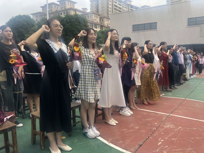 上午8:30,活動在莊嚴的升旗儀式中拉開帷幕。林偉光校長在學生的歡呼雀躍聲中帶領全校90多位教師走過紅地毯入場就座。首先,小瀝小學古箏社團和合唱隊奏唱《聽我說謝謝你》,他們用琴聲、歌聲和手語表達對老師的敬愛之情。隨后,小瀝小學少先隊員代表為全體教師送上了一束鮮花,五年級的少先隊員給老師們帶來《教師誦》。緊接著,小瀝小學全體教師在黎三妹副校長的帶領下宣誓,向全體學生和全社會做出莊嚴的承諾:立德樹人奮進擔當,教育脫貧托舉希望!最后,林偉光校長和五(1)班家長代表為30多年如一日盡職盡責、愛生如子的高淑英老師送上“守正育德”的牌匾,表示對她最衷心的感謝和最誠摯的祝愿。