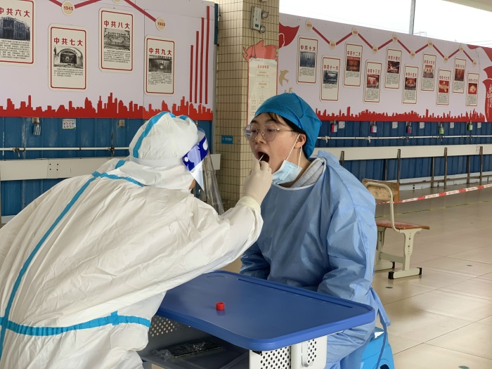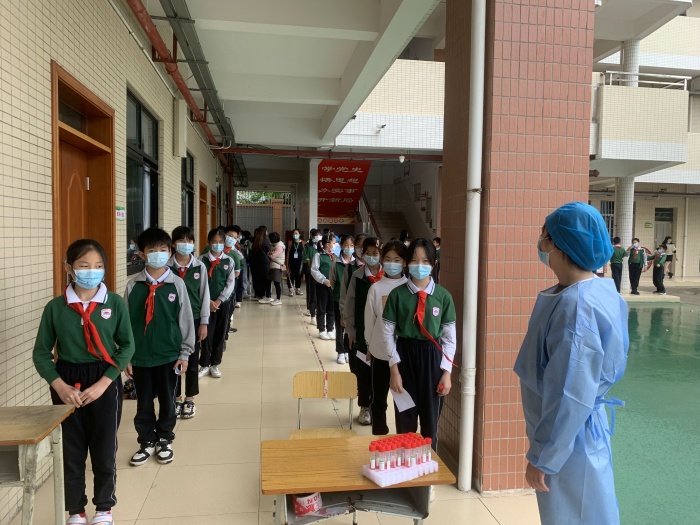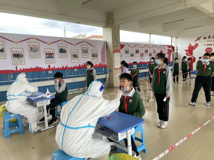 下午1點,全校老師嚴格按照學校防控工作要求,積極配合做好采樣工作。黨員志愿者、教師志愿者等深入一線,充分發揮先鋒模范作用,檢測現場進行引導秩序維護等工作,確保核酸檢測現場規范有序。現場,醫護工作人員仔細進行核酸檢測,孩子們在黨員志愿者、教師志愿者的指引下,有序排隊等候,10人一組登記信息,2個檢測單元同時展開采樣。采樣過程中,下起了小雨,學校負責人及時啟動應急預案,有條不紊安排工作,確保核酸檢測順利進行。