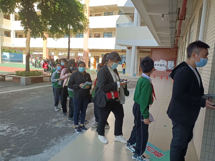 當天上午八點,學校領導、家長志愿者、全體老師就位。陪同的家長有序進校,出示健康碼、行程卡并測好體溫后,攜帶好資料前往等候區與學生匯合,接著到信息登記區錄入資料、疫苗接種區接種,并留觀半小時,整個過程十分緊湊有序。在接種過程中,學生在家長和醫生的溫柔鼓勵下,都表現得很勇敢,現場一片和諧。