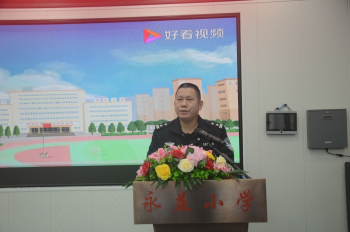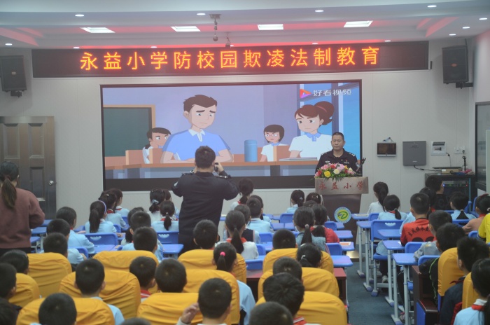 為了增強師生法制意識,進一步提高預防校園欺凌的意識和能力,2021年12月15日下午,永益小學特邀駐校民警張火根警官為四年級師生開展了一場別開生面的預防校園欺凌法制教育講座。