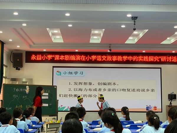 而鄧老師執教的則為五年級上冊的民間故事《獵人海力布》。鄧老師緊扣單元主題,學生在老師的引導調動下,能在理解全文、把握人物特點的基礎上讓學生創造性地復述故事,并用課本劇形式分享給大家,教學氛圍輕松愉快。