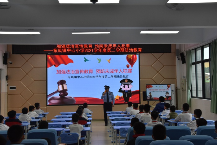 為進一步增強學生的守法和自護意識,4月19日下午,東鳳鎮中心小學開展了“加強法治宣傳教育 預防未成年人犯罪”法治教育活動,該活動邀請了學校法治副校長倫禮科以及法治輔導員陳釗和警官為同學們作講座。