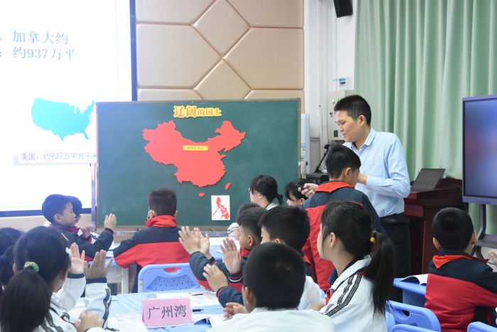 本次道德與法治展示課上,祝軍榮老師執教了一節頗具愛國情懷的優質課《遼闊的國土》。課堂生動有趣,打破了原有的傳統教學模式,祝老師運用講授法、討論法、多媒體演示法等多種教學方法,循循善誘,使課堂富有趣味性。