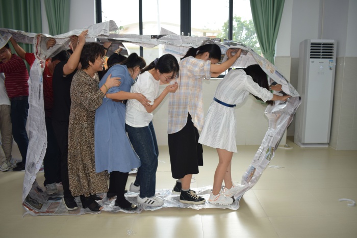 本次活動內(nèi)容豐富,形式多樣,趣味十足。王雅老師先是營造了在荒島求生大背景,然后帶領(lǐng)教師們進行三輪體驗式活動:第一輪是建立互助逃生小組,教師們自由組建7人小組,選出隊長,大伙一起商量編隊名、唱隊歌,接著進行2分鐘團隊士氣展示;第二輪是尋寶大作戰(zhàn),尋找逃出荒島的物資:6只襪子、一副眼鏡、兩個水壺、兩對鞋、一個包,比一比哪一組用時最短;第三輪是無敵風(fēng)火輪,每小組利用報紙和膠帶制作一個可以容納全體團隊成員的封閉式大圓環(huán),將圓環(huán)立起來全隊成員站到圓環(huán)上邊上行走,滾動大圓環(huán)最快的為最終贏家。三輪活動總分前三名的小組勝出。每一輪活動結(jié)束后,王雅老師都會組織教師們進行5分鐘的反思分享,思考在這個環(huán)節(jié)中小組成員或自己為什么這么快或這么慢完成任務(wù)?贏了或輸了的原因是什么?下一次個人或團隊如何才能做到最好?教師們在分享環(huán)節(jié)能積極發(fā)言,結(jié)合自己的切身體會分享了自己的所見所聞、所思所想,得到了老師們的一致好評。