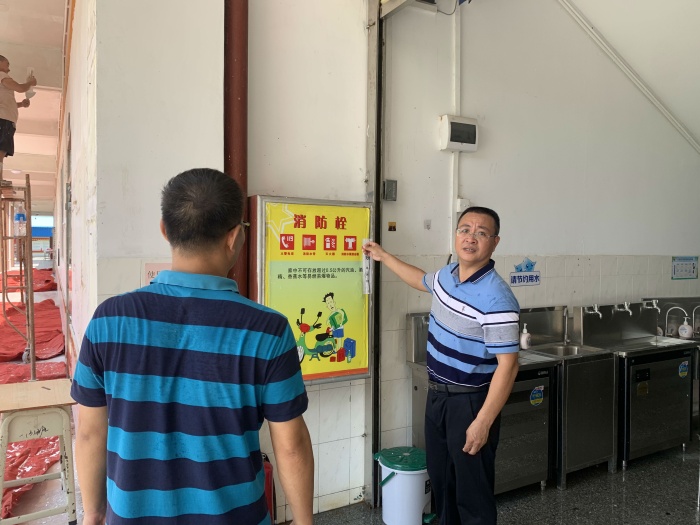 最后胡小明校長對防疫安全工作也進行了仔細的檢查,包括學校的校門、體溫檢測點、隔離室、教室、飲水機處等場所的疫情防控措施落實情況,錯峰上學、放學方案、就餐安排、衛生消毒、物資準備等復學準備工作情況,
