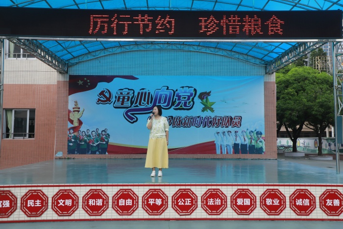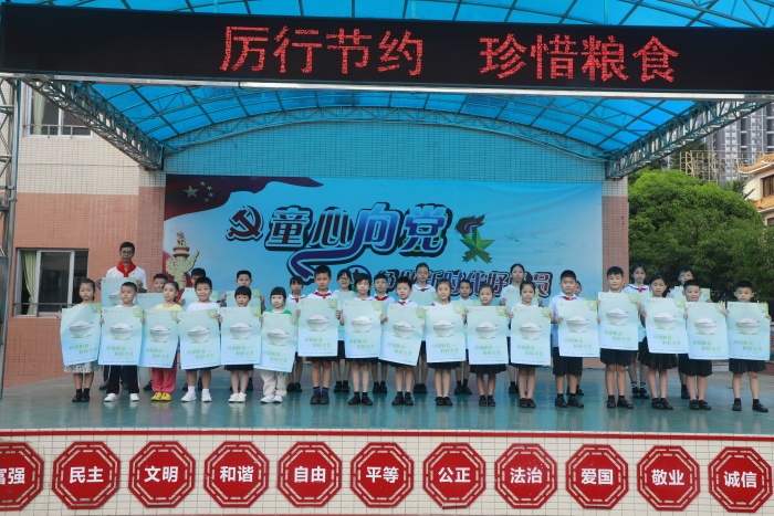 隨后,教務(wù)處趙郭皓副主任帶領(lǐng)全校師生齊誦“惜食節(jié)儉”的古詩詞名句,感受和傳承中華節(jié)儉美德。簡短的誦讀中,大家深深感悟到:當(dāng)今時代人們雖然不再缺衣少食,但土地能承載和產(chǎn)出的資源始終有限,“厲行節(jié)約、反對浪費”的傳統(tǒng)不能忘、不能丟。最后林小舟校長向每個班級代表頒發(fā)了“珍惜糧食,粒粒辛苦”的宣傳海報,倡議全體少先隊員從小事做起,從自己做起,從點滴做起,節(jié)約每一粒米,共同養(yǎng)成勤儉節(jié)約好習(xí)慣。