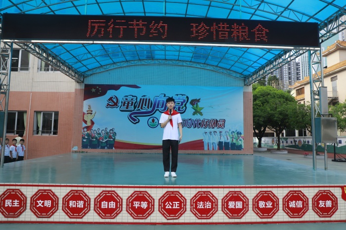 為深入貫徹落實習(xí)近平總書記對制止餐飲浪費的重要指示精神,進(jìn)一步弘揚中華民族勤儉節(jié)約的傳統(tǒng)美德,教育學(xué)生積極傳遞節(jié)約理念,樹立節(jié)約意識,踐行“光盤行動”,做新時代“勤儉節(jié)約”好隊員。2020年9月7日,東區(qū)柏苑中心小學(xué)德育處鄭樂韻主任以“厲行節(jié)約,珍惜糧食”為主題作國旗下講話,號召貫徹落實習(xí)近平總書記的重要指示精神,明白“浪費可恥,節(jié)約為榮”的道理,爭做勤儉節(jié)約“小喇叭”。